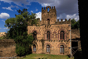 Auf der Rückseite der Halle lohnt sich auf dem Weg zum Elfin-Tor ein Abstecher zu den ehemaligen kaiserlichen Bädern. Leider wurden auch diese durch das britische Bombardement 1941 schwer getroffen. Die Sauna ist mitsamt dem von außen befeuerten Saunaofen aber noch gut zu erkennen. Mit der Erkenntnis, dass es auch die Kaiser gerne mal warm hatten, folgen wir Yitbarek über die Asasame-Mikael-Kirche zum Palast der Kaiserin Mentawab. Es ist der nördlichste Palast von Gemp und, so vermutet man, der letzte, der hier gebaut wurde.