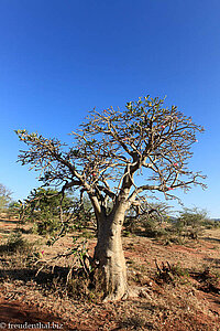 Wir befinden uns im Gebiet des Omo Rivers, in der »Region der südlichen Nationen, Nationalitäten und Völker« im Südwesten von Äthiopien. Ein wasserführender Fluss ist während unserer Fahrt zum Dorf der Karo durch den Omo-Nationalpark lange Zeit weit und breit keiner zu sehen. Und das Wadi, welches wir kreuzen, gehört wohl eher zum Keske-River. Riesige Kuhherden suchen darin nach ihren Wasserlöchern. Dafür durchstreifen wir auf Staubstraßen herrliche Savannen. Hin und wieder stolzieren große Vögel durch das Dornengestrüpp. – Leider unfotografierbar. Dafür halten wir bei einer Ansammlung von Wüstenrosen.