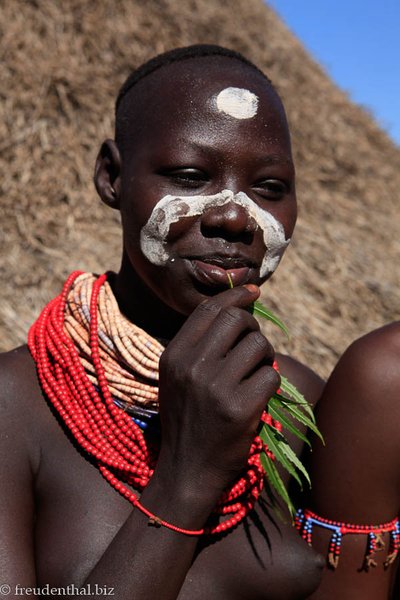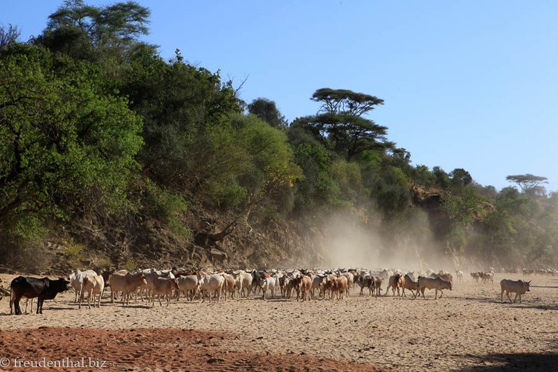 Wir befinden uns im Gebiet des Omo Rivers, in der »Region der südlichen Nationen, Nationalitäten und Völker« im Südwesten von Äthiopien. Ein wasserführender Fluss ist während unserer Fahrt zum Dorf der Karo durch den Omo-Nationalpark lange Zeit weit und breit keiner zu sehen. Und das Wadi, welches wir kreuzen, gehört wohl eher zum Keske-River. Riesige Kuhherden suchen darin nach ihren Wasserlöchern. Dafür durchstreifen wir auf Staubstraßen herrliche Savannen. Hin und wieder stolzieren große Vögel durch das Dornengestrüpp. – Leider unfotografierbar. Dafür halten wir bei einer Ansammlung von Wüstenrosen.