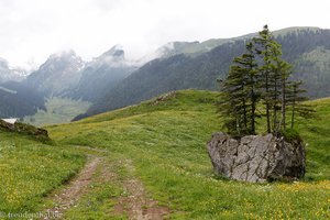 Unsere Wanderung zum Sämtisersee startet im Nebel. Bereits auf dem Weg zum Kastensattel lichtet sich dieser jedoch ein wenig. Hin und wieder geben kleine Lücken sogar die Sicht frei bis zu den österreichischen Bergen. Auch ist der Pfad zum Kamor nun deutlich besser als bei unserem Aufstieg auf den Berg Hoher Kasten zu sehen. Insgesamt aber bleibt es neblig im Osten und wolkig im Westen. Nach wenigen dramatischen Ausblicken zurück zum mal sichtbaren, dann wieder in den Wolken verschwundenen Gipfelbereich verlassen wir den Grat. Etwa 30 Minuten ab dem Kastensattel nutzen wir schließlich die erste Abstiegsmöglichkeit zum Sämtisersee.