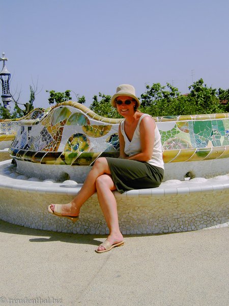 In der Nähe von dem Haus befindet sich Gaudis berühmte Schlangenbank. Dort sitzen bei sonnigem Wetter massenhaft Leute und lassen sich in der Mittagssonne munter verbrutzeln. Die Bank bietet zwar für sehr viele Leute Platz, doch leider gibt es dort kaum Schatten und auch im Frühjahr brennt die Sonne unheimlich auf den Platz. So hält es tatsächlich keiner allzu lange hier aus. Uns kann es recht sein. Denn so bleiben weite Bereiche der aus farbigen Kachelbruchstücken und Glassplittern erstellten Mosaiken frei. Dieser Teil der Schlangenbank bildet übrigens zugleich den Rand des Daches der großen Markthalle.