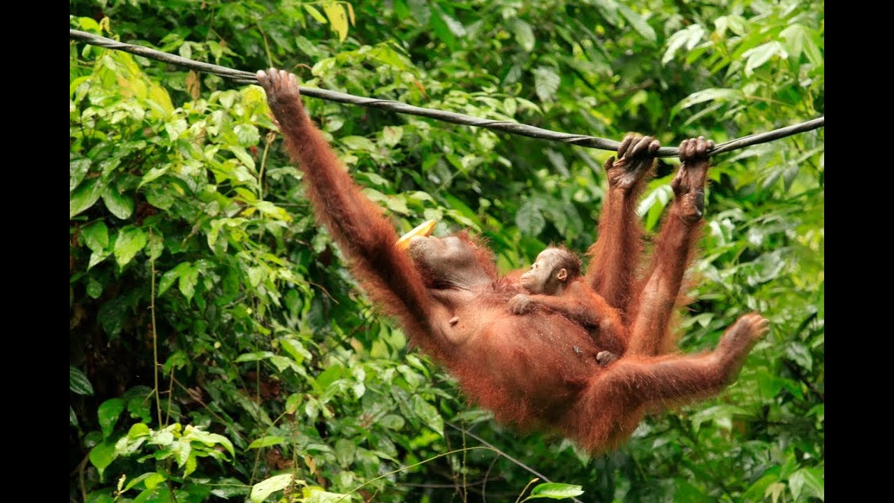 Einzig von den Orang Utan ist auch noch einige Zeit nach dem Beginn der Fütterung nichts zu sehen. »Sitzen bei dem Wetter wahrscheinlich alle in der Cafeteria«, denk’ ich mir. So ist ein kleines Hörnchen das erste Tier, was die Aufmerksamkeit der Besucher auf sich zieht. Mit einer Viertelstunde kommt dann endlich der erste Orang Utan. Es ist ein Junges, das brav an der Hand eines Pflegers mit auf die Plattform zu den ausgelegten Früchten spaziert, obwohl es gar keinen Hunger hat. Kurz darauf aber raschelt es in der Ferne und turnen zwei Weibchen an den Drahtseilen zur Plattform.