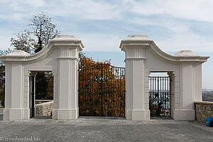 Eine Besonderheit ist hingegen das Tor, durch dessen Seitentür wir auf die Plattform direkt vor der Burg gelangt sind. Von oben sieht es so aus, als könne man durch das mittlere Tor des sehr repräsentativ wirkenden Gebildes hindurch laufen. Sollte das Gitter mal offen stehen, müssen wir davon allerdings dringend abraten. Denn auf der anderen Seite des Tors geht es einfach nur steil bergab.