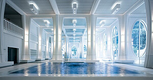 Denn auch wenn wir schon Bilder der Tamina Therme im Internet und in Prospekten gesehen hatten, so kann dies doch nur einen ersten Eindruck von der Eleganz der Therme mit ihren vielen hohen Säulen und Fenstern vermitteln. Schon beim Eingangs- und Gastronomiebereich staunen wir, wie hoch sich eine Decke über den wenigen Tischen befinden kann. Hier ist alles groß-zügig angelegt und, das merken wir an der Kasse, außerdem praktisch. So müssen wir uns nicht im Vorfeld darauf festlegen, wie lange wir bleiben möchten, sondern kriegen ein Armband mit Chipmarke, welches unsere Aufenthaltszeit und die Extras speichert.