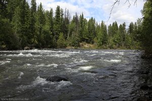 Nach etwa einer Stunde kommen wir zu einer Stelle, an welcher der Murtle River vom Trail aus zugänglich ist. Ein Blick flussabwärts verrät, dass man hier besser nichts ins Wasser fällt. So endet der Fluss abrupt an einer Kante. Wie tief es bei dieser nach unten geht, ist nicht zu sehen. Wohl aber ist das stete Donnern und Grollen des nahen Wasserfalls gut zu hören.