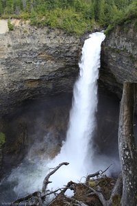Schließlich entscheiden wir, dass es keinen besseren Aussichtspunkt auf dieser Seite mehr geben kann und kehren zurück zu zwei Stellen, bei denen sich die Sicht auf den Wasserfall öffnet. Es ist allerdings nicht ungefährlich. Denn um einen besonders spektakulären Blick auf die Helmcken Falls zu bekommen, muss man sich an einem der Bäume direkt am Rand sichern und vorsichtig nach vorne beugen. Zugleich sollte man sicher sein, dass der Baum - und auch der Untergrund - das zusätzliche Gewicht trägt. Andernfalls braucht man sich um den Rückweg keine Gedanken mehr machen.