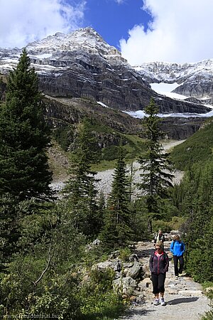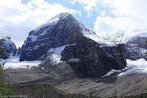 Gut erholt nehmen wir die letzten knapp anderthalb Kilometer zum Aussichtpunkt über der Plain of Six Glaciers in Angriff. Mit dem Mont Lefroy vor Augen erinnert uns nochmals eine Tafel an den tragischen Absturz von Phillip Abbot im Sommer 1896. Doch wie Menschen so ticken, war es ausgerechnet sein Tod, der das Interesse der Kanadier am Bergsteigen und Klettern noch bestärkte. So erreichte am 3. August 1897 eine Gruppe den Gipfel vom Mont Lefroy und bezwang damit einen Berg, der bis dahin als unbesteigbar galt.