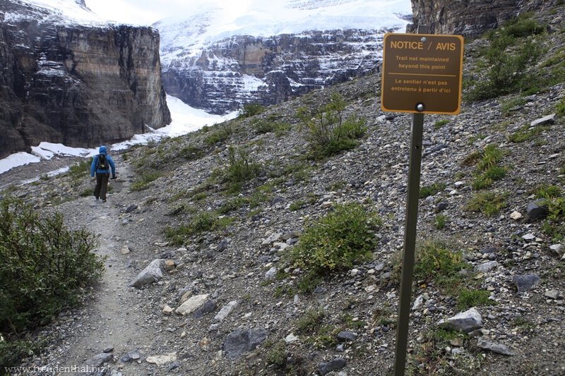 Auch wenn der Trail beim Aussichtspunkt endet, so heißt das nicht, dass es nicht mehr weiter geht. Es ist eine Gruppe junger Wanderer, die an uns vorbei Kurs auf die Steilwand unterhalb vom nördlichen Gipfel des Victoria Peaks und dem daran anschließenden Grat mit dem Collier Peak und Pope's Peak nimmt. Allein empfehlen können wir die nur schwach ausgebildeten Trampelpfade dorthin nicht. Denn sie führen direkt in einen Bereich, in dem es häufig zu Steinschlägen kommt. Da wir keine Lust auf mineralische Kopfnüsse haben, kehren wir um und wandern auf demselben Weg zurück zum Plain of Six Glaciers Teahouse.