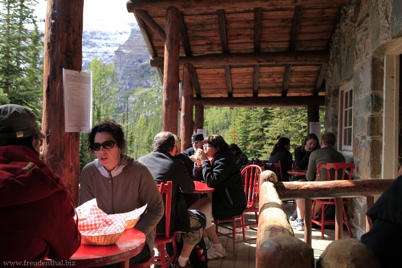 Vier Stunden nach unserem Aufbruch am Chateau erreichen wir das Plain of Six Glaciers Teahouse. Die zweigeschossige Hütte kommt wie gerufen für eine längere Pause. So sehen das auch die anderen Wanderer um uns herum. Allesamt steuern sie auf das Teehaus. Entsprechend eng geht es sowohl in dem kleinen Gebäude als auch auf der Terrasse davor zu. Anders als beim Lake Agnes haben wir Glück. So finden wir ohne groß zu warten zwei freie, sonnige Plätze auf der oberen Veranda. Wenige Augenblicke später werden wir bedient.