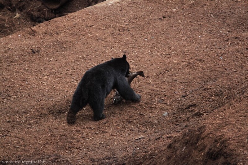 Es stinkt ein wenig. Aber das muss es auch. Denn Dan führt uns bis zu einem Platz, wo aus Holz- und Fischresten Erde mit Dünger hergestellt wird. Überall stehen Baumaschinen, die das Material tagsüber umwälzen. Und unter einer dieser Baumaschinen hocken zwei Schwarzbären, die Reißaus nehmen, sowie sie uns entdecken. So nah bei den Bären, weist uns nun auch Dan an, wie wir uns zu verhalten haben.