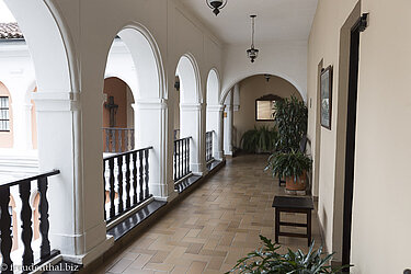 Passend zur weißen Stadt Popayán sind die Wände in dem Kolonialhotel weiß getüncht. In einer früheren Epoche war das La Plazuela vielleicht mal ein Herrenhaus der reichen Zuckerbarone. Dafür sprechen zwei hübsche Patios, die mit reichlich Pflanzen und hübschen Sitzplätzen eine ruhige Oase inmitten der verkehrsgeplagten Altstadt bilden. Das Hotel wurde kurz vor unserem Aufenthalt frisch renoviert. Antike Möbel aus früheren Zeiten werden jedoch nach wie vor genutzt und verleihen dem Gebäude ein elegantes Flair.