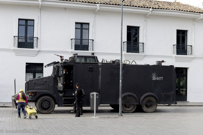 Schließlich aber müssen wir zurück ins Hotel. Die Demonstration hat sich inzwischen auf den Parque Caldas verlagert. Das könnten wir noch umgehen. Doch bereits beim Theater kommen uns zahlreiche Polizisten in voller Montur entgegen. Ihren Schutzschild heben sie wegen des starken Regens über den Kopf. Was auch sonst? Wir fragen nach, ob es im Bereich der Demo gefährlich wäre.