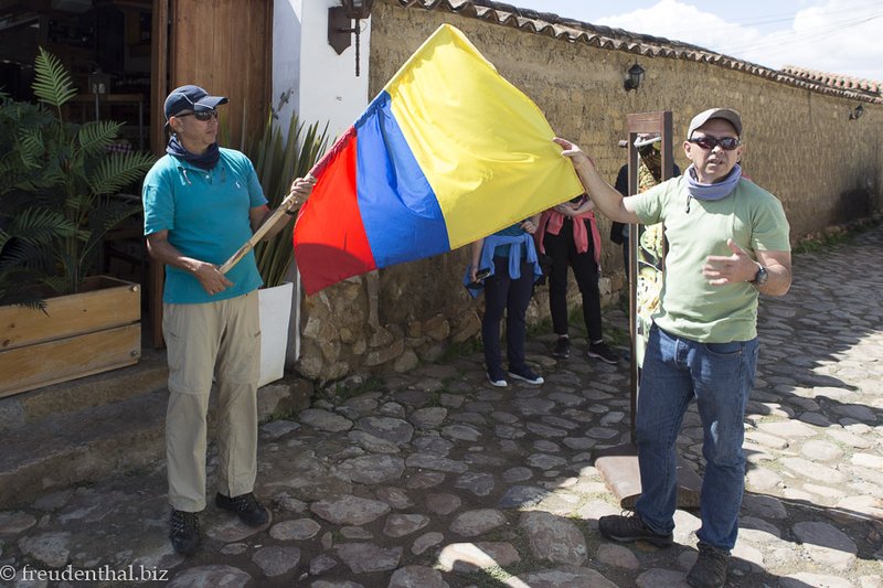 An einem der Restaurants hängt eine große kolumbianische Flagge. Für Cilfredo ist dies eine willkommene Gelegenheit, uns den Sinn der Farben zu erläutern. Der Patriot und Revolutionär Francisco de Miranda setzte sich seinerzeit für die Unabhängigkeit der spanischen Kolonien ein und träumte von einem einheitlichen lateinamerikanischen Staat mit dem Namen Kolumbien. Auch wenn seinen Bestrebungen der Erfolg verwehrt wurde, gilt er als Wegbereiter für Simón Bolívar, der die spanische Herrschaft in Südamerika beendete. Francisco de Miranda entwarf das Design der kolumbianischen Flagge, die gleichzeitig das Grunddesign für die Flaggen Venezuelas und Ecuador bildet.