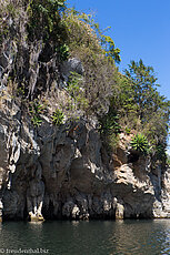 Wieder auf dem See passieren wir zerklüftete Felsen aus Muschelkalk, welche mit großen Agaven bewachsen sind. Interessanter aber finden wir die vielen Schildkröten, die uns auf einmal auffallen. Sie sonnen sich auf den Felsen oder schauen neugierig aus dem Wasser, bevor sie schnell abtauchen. Unser Ziel ist der Arroyo Trinitario-Wasserfall, welcher sich in einem Nationalpark befindet.