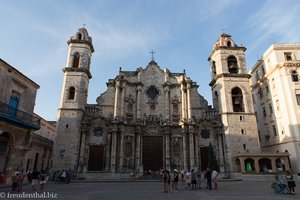 Nahe der Plaza de Armas, dem Waffenplatz, kommen wir zum Kathedralenplatz von Havanna. Die barocke Catedral de la Virgen María de la Concepción Inmaculada aus dem 18. Jahrhundert wurde 1982 von der UNESCO zum Weltkulturerbe erklärt. Das im Innern eher schlicht gehaltene Gotteshaus besitzt außen ein paar Besonderheiten, wenn man genau hinsieht. So stören die ungleichen Türme die Symmetrie. Nachdem der breite Turm stand, stellten die Erbauer fest, dass der zweite Turm den Zugang zur Calle San Ignacio versperren würde. So wurde dieser einfach schmaler gebaut. Auch in der Fassade fehlt etwas. So sind die Nischen für Heiligen-Statuen noch immer leer. Zum Schutz vor Zerstörung stehen die Statuen seit der Kubanischen Revolution im Vatikanstaat.