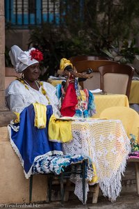 An einer Säule des Casa del Marqués de Aguas Claras sitzt eine dicke alte Kubanerin. In ihrer kolonialen Verkleidung und mit einer viel zu großen künstlichen Zigarre wartet sie auf gebefreudige Fotografen. Immerhin folgt eine Touristengruppen der nächsten auf den Platz. Eine weitere Frau versucht lauthals, bunte kubanische Puppen zu verkaufen. Vor allem aber fallen uns aufdringliche Damen auf, die den männlichen Touristen einen dicken Kuss - mit reichlich Lippenstift - aufdrücken wollen. Die Masche mit dem anzüglichen Ranschmeißen wirkt. So fallen uns doch einige Männer mit einem übergroßen Lippenabdruck auf der Backe auf.