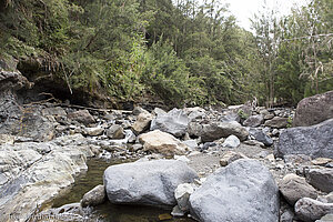 Unten angekommen, treffen wir wieder auf den Rivière du Màt. Hatten wir zu Anfang noch eine Brücke, müssen wir jetzt eine Furt suchen. Zunächst jedoch laden Badebecken, Sandbänke und rund gewaschene Steine zu einer Pause in dem wildromantischen Tal ein. Anschließend laufen wir rechts ein kurzes Stück flussaufwärts. Dort entdecken wir bald die uns versprochene Furt, die sich allerdings eher als Steinwall entpuppt, bei der wir den Fluss trocken queren können. Gegenüber hilft eine Metallleiter, eine steile Flussböschung zu überwinden. Der weitere Aufstieg erfolgt über einen Pfad bis hinauf zu den ersten Behausungen auf dem Ilet Trou Blanc. Nur noch wenige Leute wohnen hier und leben von der Landwirtschaft. Zwischen Feldern und kahlen Felsen führt der Wirtschaftsweg mal leicht bergauf, dann wieder bergab bis zur Hauptstraße. Auf dieser sind es links nur noch wenige Minuten bis zum Parkplatz, wo unsere erste schöne Wanderung auf der Insel La Réunion endet.