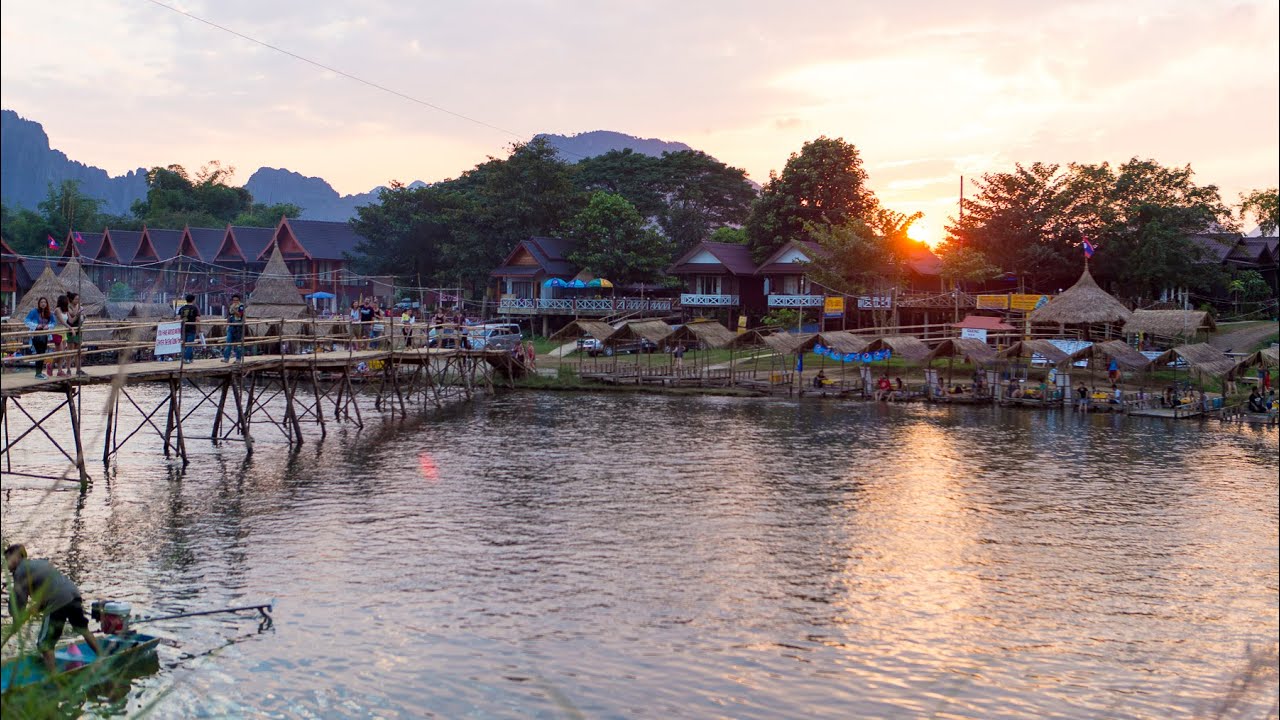 Eindrücke von Vang Vieng, das als touristische Partyhochburg von Laos gilt. Aufnahmen von der Fußgängerbrücke über den Nam Song River und die in den Fluss gebauten Partypavillons.