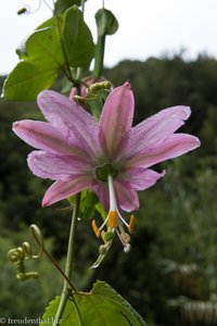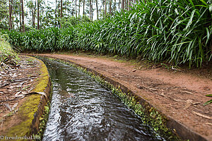 Bei einem hässlichen Wasserbecken und einer Bewässerungsanlage leitet uns das Schild »Ribeiro Bonito, 5,1 km« zwischen den Anlagen hindurch zu einer steilen Treppe. Oberhalb dieser wird ein Teil der Levada zum Wasserbecken abgeleitet. Hier kommt es zu leichten Überflutungen, sodass der Weg ganz schön matschig ist.