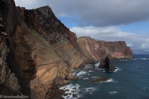 Auch wenn unser Ziel mit dem Pico do Furado ein Stück weit dahinter liegt, ist die Wanderung mit sieben Kilometern relativ kurz. Dennoch sollte man großzügig bei der Zeitplanung sein. Denn zum einen begeistert der Weg über die Ponta de São Lourenço - die Landzunge des Heiligen Lars - von Beginn an mit etlichen schönen Aussichten. Und zum anderen geht der Küstenwind ganz gut an die Kondition. Zuletzt sind es mehrere Anstiege, die einem zügigen Vorankommen entgegenwirken.