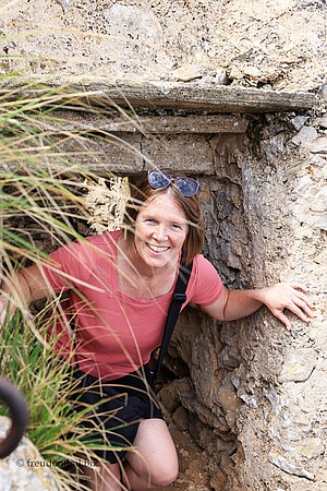 Noch vor dem Bunker erfolgt der Aufstieg zum Gipfel der Penya des Migdiá. Der steinige Pfad ist mit Steinmännchen gut markiert, erlaubt jedoch nur ein langsames Vorankommen. Zusammen mit der hier starken Sonneneinstrahlung treibt uns die Steigung bald den Schweiß auf die Stirn. Ab dem Abzweig zum flacheren Nebengipfel trennt uns noch ein kurzer Kraftakt vom Hauptgipfel. Umso schöner ist es anschließend, den Blick über die Halbinsel, die Küste und zum schweifen zu lassen. Tatsächlich ist der Gipfelbereich erstaunlich gut ausgebaut, sodass hier mehrere Wanderer bequem Platz finden.