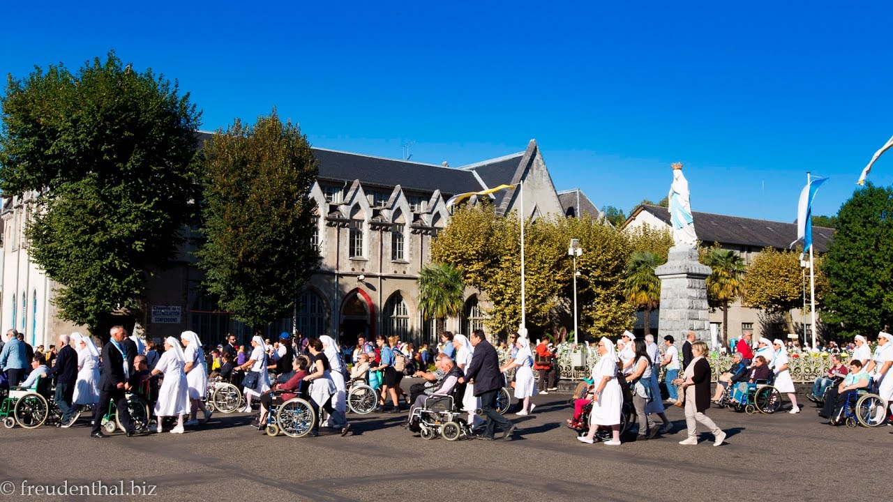 Aufnahmen der Prozession der Rollstuhlfahrer und Kranken in Lourdes. Während der Pilgersaison wiederholt sich dieses traurige Bild hoffnungsvoller und auch verzweifelter Menschen tagtäglich.
