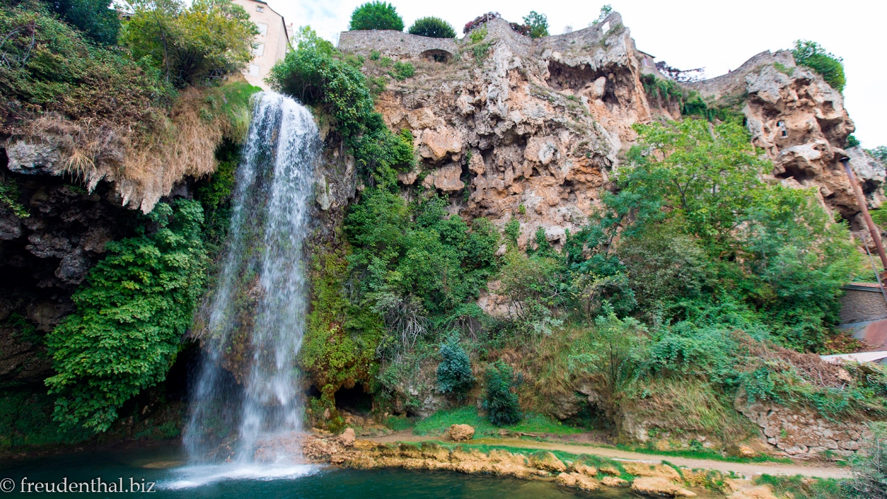 Von der Durchgangsstraße – Parkmöglichkeiten sind genügend vorhanden – trennt uns nur ein kurzer Fußweg von der Kaskade. Das Becken, in das sich die namensgebende Quelle als 20 Meter hoher Wasserfall ergießt, ist parkähnlich gestaltet. Von der Straße aus sieht die Kaskade jedoch einiges spektakulärer aus.