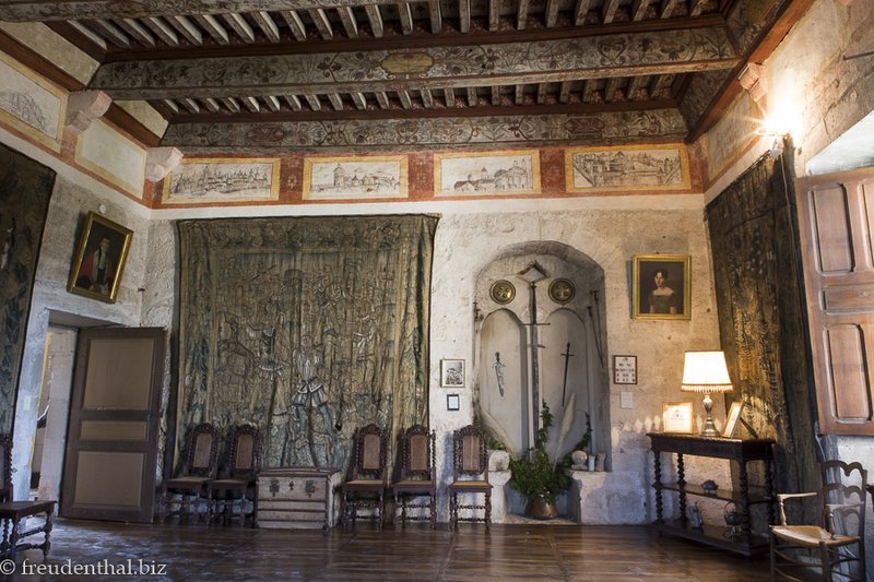Vom Burghof sowie der oberen Dachterrasse eröffnet sich uns ein herrlicher Blick über das Tal des Lot. »Normalerweise ist hier alles grün,« meint Patrick »doch wir haben dieses Jahr eine extreme Trockenzeit«. Das Gebäude wird heute noch von den Burgherrn bewohnt, weshalb einige Bereiche »privé« sind. Eine Auswahl an Räumen kann jedoch bei einer Führung besichtigt werden. So zeigt uns Patrick einige geheimnisvolle Zimmer und so manch Prunkstück. Die Wände sind verziert mit gut erhaltenen Gobelins aus Flandern und Fresken, die Städte aus dem Orient zeigen. Prachtvoll ist auch die Renaissance-Kassettendecke, die erst in jüngerer Vergangenheit wieder freigelegt wurde.