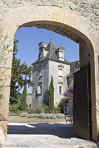 Nur wenige Kilometer von Saint-Cirq-Lapopie entfernt, befindet sich flussaufwärts am Lot das hübsche Château de Cénevières. Bereits das Burgtor erinnert an ein Märchenschloss. Wir sind angemeldet und klingeln im Burghof beim nächsten Tor. Zunächst werden wir jedoch in dem auf einer Anhöhe gelegenen Schloss von einer kräftigen Windbö empfangen. Sekunden später öffnet sich das Tor und wird das Burgfräulein fast aus dem Schloss geweht. Dann fällt das Tor hinter ihr wieder krachend in seine Angel und ist der Spuk vorbei. Der Schlossherr Patrick soll unsere Führung übernehmen. Da er noch mit einer anderen Führung beschäftigt ist, warten wir im Vorhof. Bald ebbt der Wind wieder ab, sodass wir die wärmende Sonne und Ruhe genießen können.