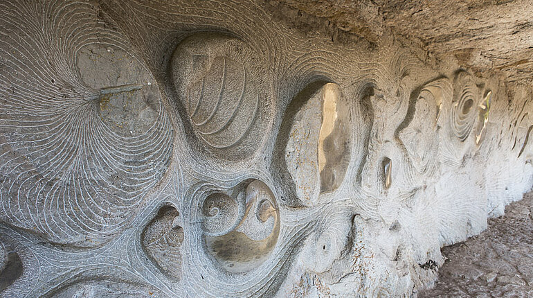 Spaziergang über den Chemin de halage, dem Treidelpfad entlang des Lot bei Bouziès. Aufnahmen von der Felsengalerie mit den Skulpturen des Bildhauers David Monnier.