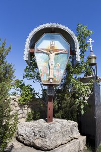 Orheiul Vechi hat uns mit traumhaftem Wetter empfangen. Und durch die insgesamt doch eher kurze Anreise ist es noch früh am Tag. Warum also die Besichtigungen auf morgen verschieben, nur weil es so in unserem Reiseplan steht? Also sind wir schon bald wieder auf den Beinen und spazieren von der Resedinta Rotundu ins Dorf von Butuceni. Mir war so, als hätte ich bei der Fahrt einen Weg hoch auf den Butuceni-Hügel gesehen. Tatsächlich finden wir diesen gegenüber der Villa Etnica, wo sich bei einer Art Dorfplatz der Weg gabelt. Ein Jesuskreuz markiert die Ecke, ab der wir links davon den Feldweg steil nach oben nutzen.