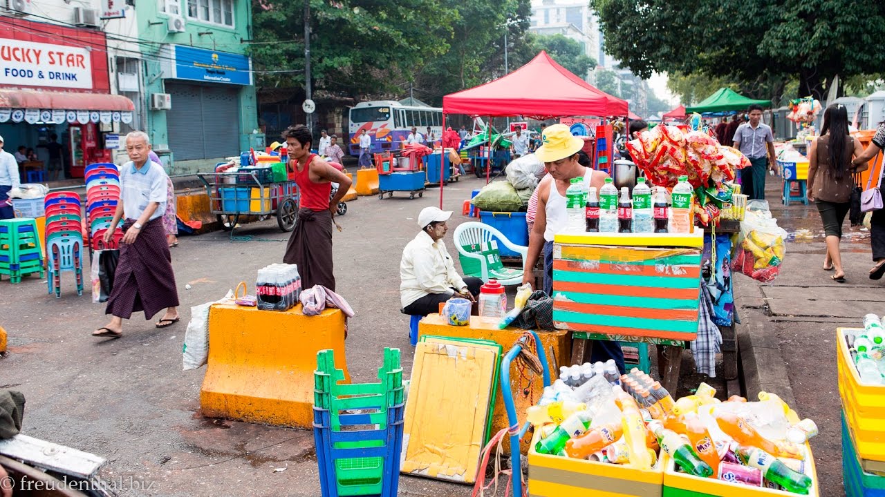 Kurzer Spaziergang durch die Altstadt von Yangon oder auch Rangun. Aufnahmen von einem Straßenmarkt nahe dem Maha Bandula Park.
