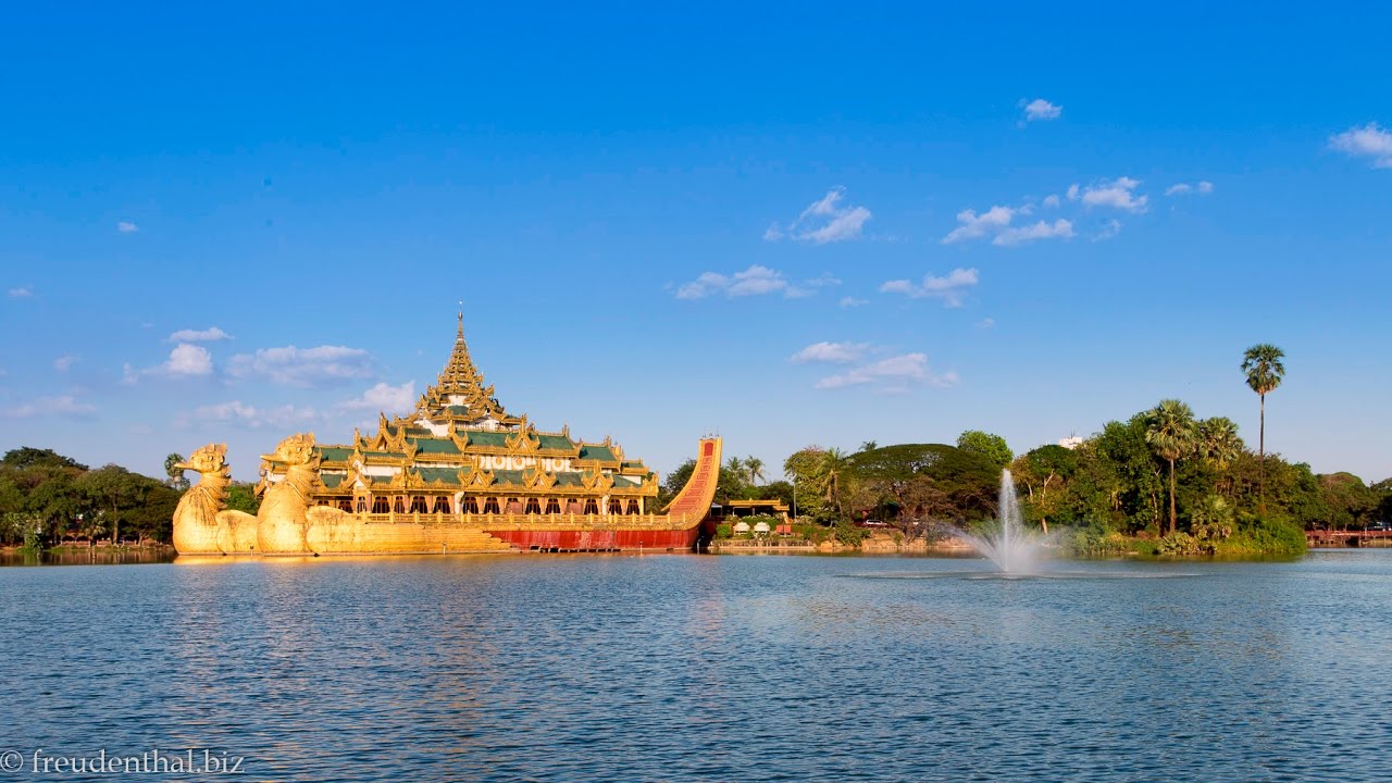 Das Karaweik Palace ist eine Nachbildung eines burmesischen Königsschiffs und wurde nach Plänen des Architekten U Ngwe Hlaing errichtet. Nach gut zweijähriger Bauzeit wurde das Schiff im Oktober 1974 fertiggestellt. In der bereits tief stehenden Sonne glänzt es golden auf dem Wasser.