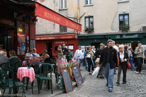 Von der Kirche Saint-Pierre de Montmartre laufen wir noch ein paar Meter bis zum Wasserturm an der Rue du Mont Cenis, kehren dann aber um und spazieren zur Place du Tertre. Aus unserer Sicht zählt der kleine Platz zu den schönsten überhaupt in Paris. Eine Meinung, mit der wir nicht alleine stehen.