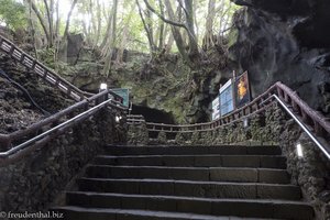 Durch mehrere Einstürze der Decke entstanden bei Manjanggul drei Eingänge. Wir nutzen den zweiten Eingang, einen von hohen Bäumen umsäumten Schlund in der Erde. Ordentliche Treppen führen sicher und gut beleuchtet hinab in die Höhle. Im Innern laufen wir dann auf dem natürlichen Lavagrund, der angenehm eben, wenn auch teilweise etwas glatt ist. Die Wände sind bunt ausgeleuchtet. Die Fledermäuse bevorzugen wohl auch deshalb die hinteren 6,4 Kilometer der Höhle als Quartier.