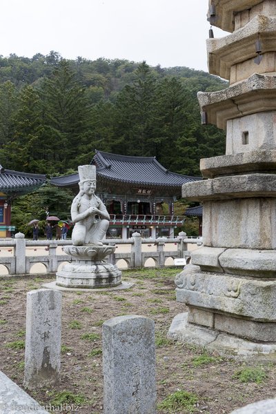 Zurück über die acht Kilometer lange Schotterpiste vom Sangwonsa Tempel durch den Odaesan, erreichen wir im Süden des Nationalparks den Woljeongsa Tempel. Auf dem Parkplatz wird gerade Markt gehalten. Die Chancen stehen gut, hier noch eine Kleinigkeit zum Essen zu finden. Bei unserer zuvor geleisteten Wanderung war das kulinarische Angebot ja eher vom Glück abhängig. In unserem Fall trafen wir ein paar nette Koreaner, die mit uns ihren Maroni-Proviant teilten. Die koreanische Gastfreundschaft erfreut uns doch immer wieder.