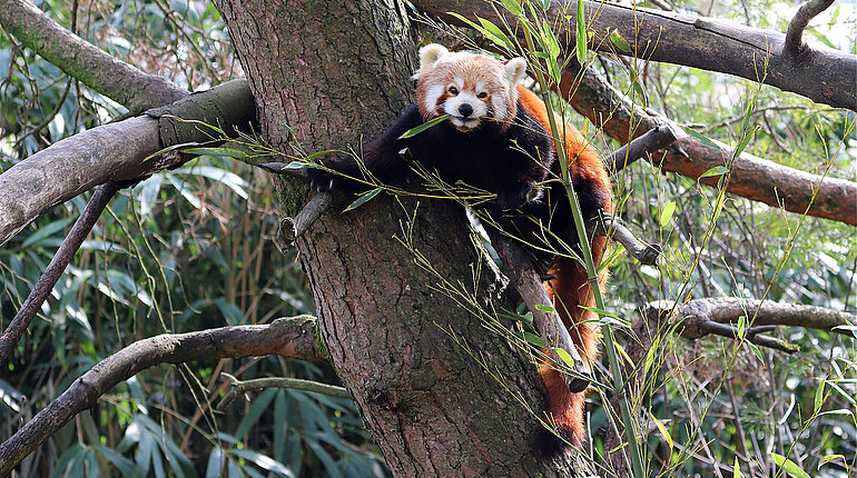 Beim weiteren Rundgang folgen die Gehege der Greifvögel. Neben Habichtskäuzen und Kanincheneulen entdecken wir einen Schmutzgeier. Entgegen seinem Namen ist die im westlichen Mittelmeerraum heimische Art ein ausgesprochen schöner Geier. An den Wölfen vorbei herrscht plötzlich Aufregung. Von mehreren Zweigen zunächst verdeckt, turnt ein Kleiner Panda durchs Geäst. Normalerweise ist das auch als Roter Panda oder Katzenbär bekannte Tier nachtaktiv. Ob der muntere Kletterer zu viele Nachrichten über Sperrstunden gesehen hat? Wir hoffen es nicht.