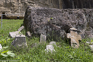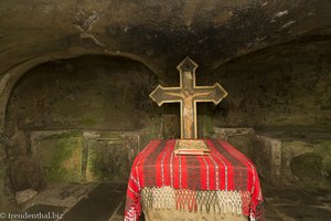Was auch sonst? Wir spazieren den Weg hinauf zur Felsenkirche, die sich tapfer unter der Last einer 20 Meter hohen Felswand behauptet. Daneben befindet sich das offene Refektorium des ehemaligen Klosters.