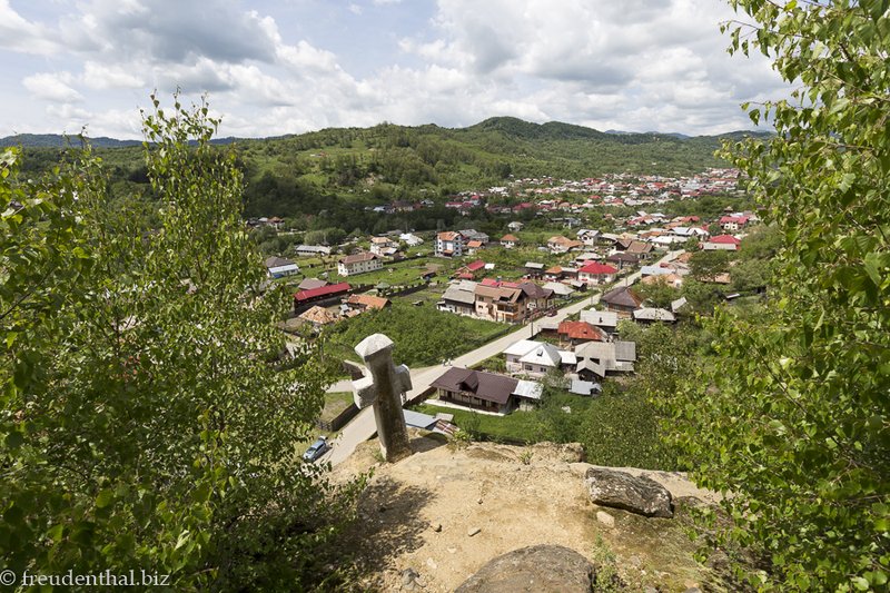 Ein steiler Weg führt neben dem Kirchlein hinauf auf den mit einem Kreuz gekrönten Felsen. Nach dem Aufstieg blicken wir über die Dächer von Corbi, welches idyllisch im grünen Tal des Flusses Doamnei gelegen ist. Da wir nicht wissen, wie weit der Spazierweg über den Felsen hinweg führt, belassen wir es jedoch bei einem kurzen Abstecher. Wir sind bereits eine gute Weile unterwegs und haben langsam Durst. Bei der Anfahrt hatten wir im Ort einige Läden gesehen, von denen wir den nächstgelegenen ansteuern.