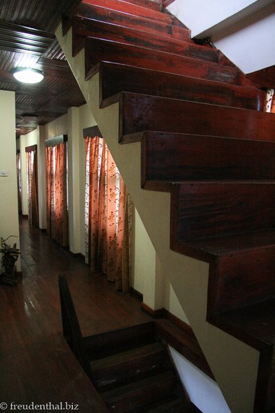 Leider reicht das Treppengeländer nur bis zum ersten der drei Stockwerke. Damit aber können wir ja noch leben. Schließlich haben wir nicht vor, nachts trunken durchs Hotel zu stolpern.