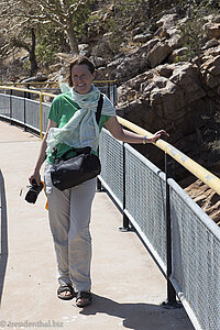 Oben angekommen eröffnet sich uns eine herrliche Aussicht über den See und das Resort in der Oase. Es ist ein wahrlich schöner Platz. Wenn es nur etwas windstiller wäre. So klettern wir die Stufen wieder hinab und spazieren um einen Berg herum zur nächsten Staumauer.