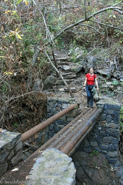 Da wir bei trockenem Wetter ankommen, ist der Wasserstrahl keine wirkliche Bedrohung. Bei einem Wolkenbruch kann sich dies jedoch binnen weniger Stunden ändern und so viel Wasser in den Kessel stürzen, dass ganze Felsbrocken und Bäume das Flussbett heruntergespült werden.