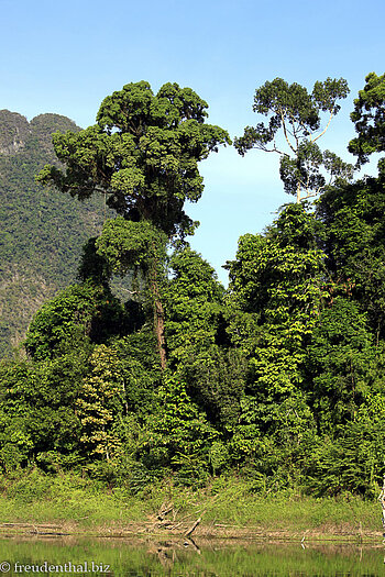 Genauer: In einer Bucht auf dem Chiao-Lan-See, der - glauben wir Adam - im Bereich der neuen Hütten 26 Meter tief ist. An lediglich drei Stellen gibt es Verbindungen zum Festland. Von Spaziergängen an Land wird uns allerdings abgeraten. Denn anders als direkt auf dem See lauern dort Moskitos auf ungeschützte Touristen.