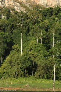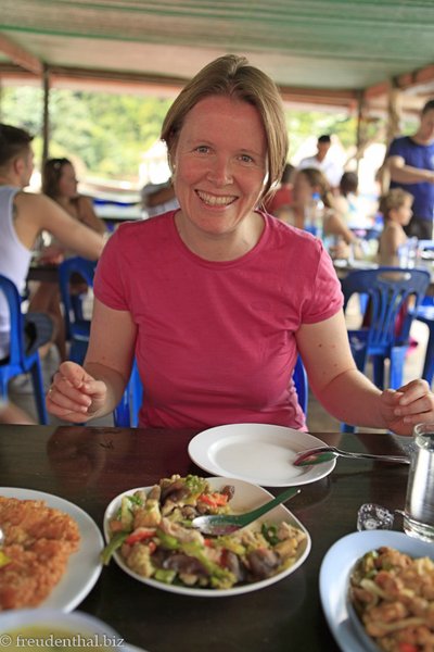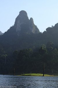 Genauer: In einer Bucht auf dem Chiao-Lan-See, der - glauben wir Adam - im Bereich der neuen Hütten 26 Meter tief ist. An lediglich drei Stellen gibt es Verbindungen zum Festland. Von Spaziergängen an Land wird uns allerdings abgeraten. Denn anders als direkt auf dem See lauern dort Moskitos auf ungeschützte Touristen.