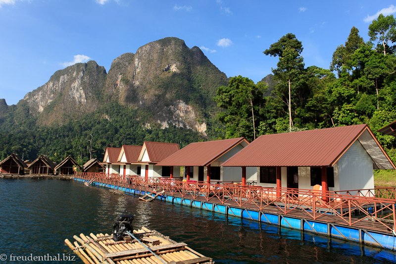 Das Pleanprai Rafthouse ist eine der besondersten Unterkünfte, bei denen wir bisher je übernachtet haben. Denn wie das Hauptgebäude mit dem Restaurant und die sanitären Anlagen mit Schöpfduschen und Toiletten schwimmen auch die Hütten allesamt auf dem See.