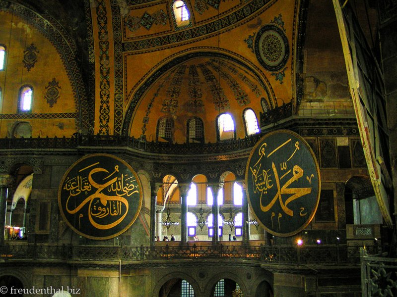 Prächtig ist die riesige Kuppel. Lange wurde erfolglos versucht, so eine Kuppel nach zu bauen. Ganz schön und ein Zeichen dafür, dass die Haghia Sophia als Moschee genutzt wurde sind die großen Rundschilde, die an den Pfeilern verteilt wurden und in kalligraphischen Schriftzügen Allah, Mohammed und verschiedene Kalifen nennen.