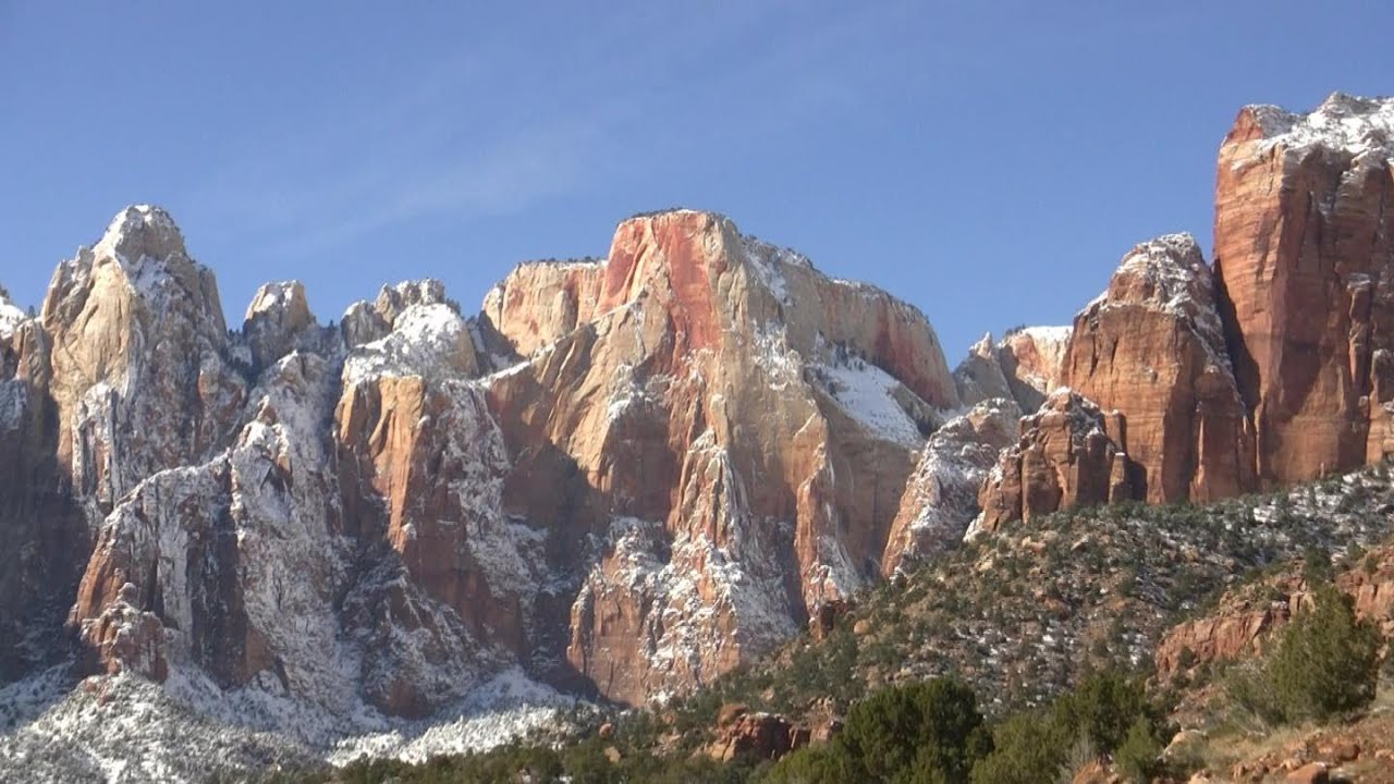 Ganz ehrlich: dafür, dass ein Blizzard den Ablauf unserer Rundreise auf den Kopf gestellt hat, werden wir mit einem echt tollen Wetter versöhnt. Am strahlend blauen Himmel sind nur wenige Schleierwolken zu sehen, die verschneite Landschaft mit den steil aufregenden Bergen und dem Virgin River sieht wie mit Zucker überpudert aus und die Luft ist herrlich klar.