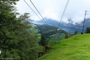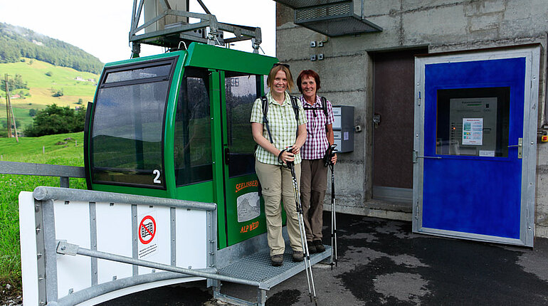 Da wir später noch genug Höhenmeter zu bewältigen haben, spazieren wir jedoch nur bis zur 900 Meter entfernten Talstation der Luftseilbahn Seelisberg-Weid. Ab dort lassen wir uns mit der Bahn bequem zur 456 Meter höheren Bergstation hinauffahren. Da es lediglich zwei Kabinen für je vier Personen gibt, werden die Tickets am Automaten gelöst. Das ist zwar ungewohnt, aber doch so gut beschrieben, dass wir ohne Probleme starten können.