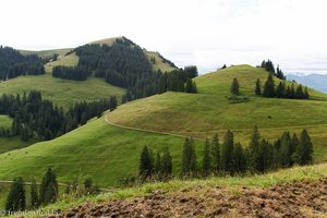 Damit wechseln wir auf die andere Seite des Bergs, sodass wir auf den Zugersee hinuntersehen können. Schauen wir zurück, haben wir immer wieder freie Sicht auf den Gipfel der Rigi. Zudem entdecken wir die blaue Zahnradbahn, die zwischen Goldau am See und Kulm verkehrt, während wir selbst durch eine Berglandschaft mit sanften Kuppen und Tälern, saftig grünen Almen und Wäldern, vor allem aber etlichen Bergrindern wandern.