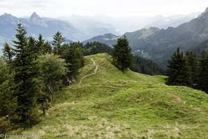 Auch ist ein guter Orientierungssinn sicher von Vorteil. Denn nachdem man ein Stück weit direkt am Kamm mit Sicht auf den Lauerzersee läuft, setzt der Wanderweg auf einer Hochalm teilweise aus. Stellenweise ist der Pfad nur an Trittschäden zu erkennen, die schräg hinab in den Wald (mit einem Drehkreuz) führen. Erst im Wald (und mit den nächsten schönen Ausblicken über den Vierwaldstättersee) wird der Weg wieder besser. So können wir das nächste Teilstück unserer Wanderung mit Blick auf den Gipfel des Hochflue (1.699 m) in vollen Zügen genießen. Das einzige, was lästig bleibt, sind die kleinen Regenschauer.